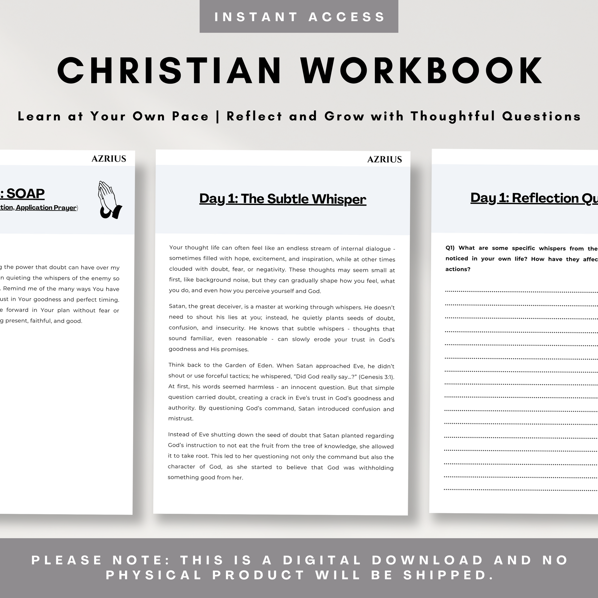 In this empowering 5-day workbook, you’ll uncover the subtle tactics the enemy uses and learn how to stand firm against them. Through practical exercises, Scripture reflection, and deep personal insight, you will discover how your thoughts shape your life. You’ll also learn how to take control, rejecting negativity and aligning your mind with God’s truth.